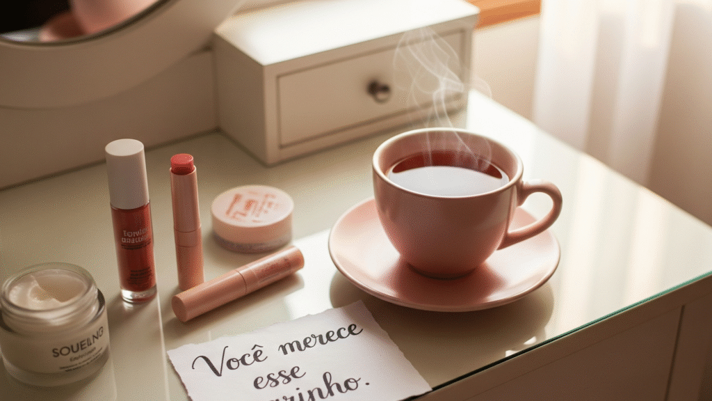 Cuidar de si mesma não precisa ser caro, nem complicado. Muitas vezes, o autocuidado começa com pequenos rituais do dia a dia: passar um hidratante no rosto com calma, aplicar um pouco de blush, escolher um batom que combina com o seu humor. Gesto simples, mas cheio de intenção.